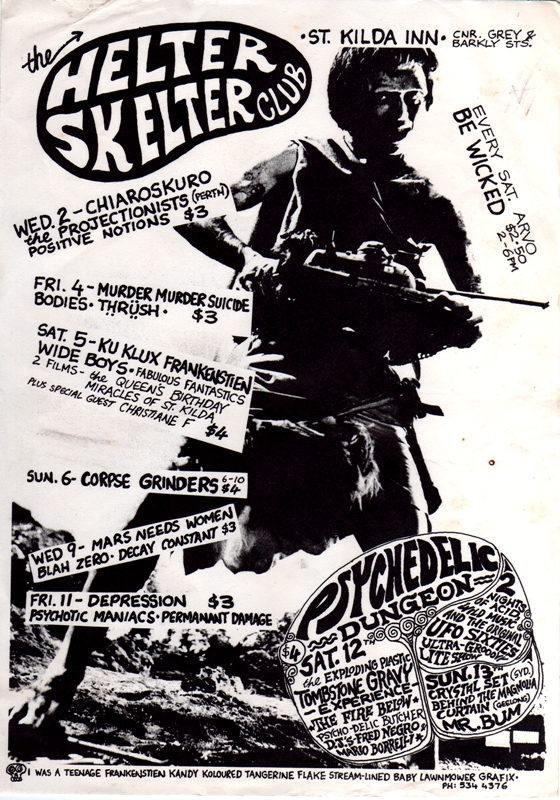 Over a 12-18 month period The Helter Skelter club attracted a great line-up of local and interstate punk and post-punk bands including The Triffids, Orchestra of Skin and Bone, Wet Taxis, Zimmermen, Huxton Creepers, I Spit on Your Gravy, Tombstone Hands, Gas Babies, Murder Murder Suicide, The Bodies, The Tribe, Depression, Psychotic Maniacs, Permanent Damage, Grong Grong, Shower Scene From Psycho, Corpse Grinders, Perdition, Vicious Circle, M-16, Radio Birdman, Painters and Dockers, Honeymoon in Green, The Wet Ones, Civil Dissident, Olympic Sideburns, The Mess, and many more…