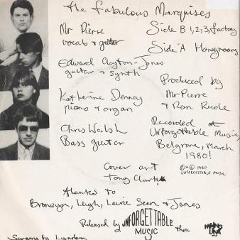 The Fabulous Marquises was formed in 1980 by ex-JAB, Teenage Radio Stars and Models Bass player 'Mr Pierre'. The band had a sparse and electronic sound and a